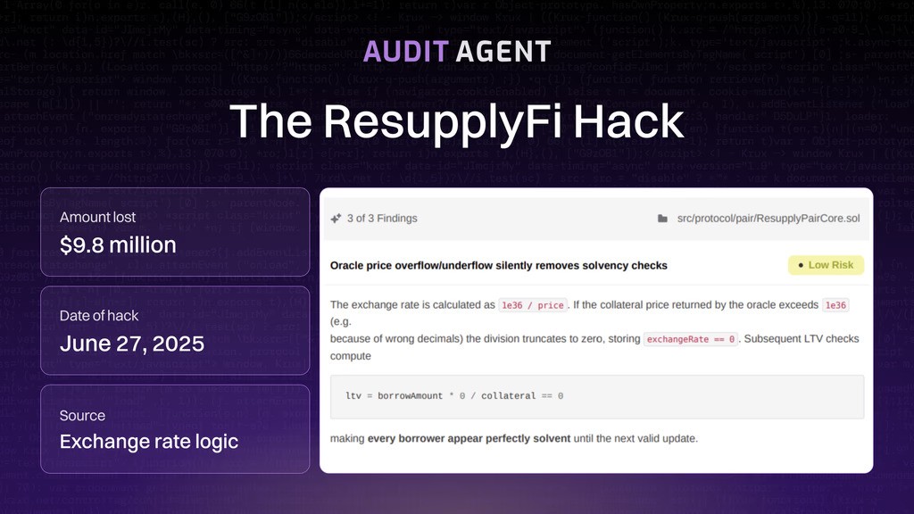 On June 27, 2025, ResupplyFi lost $9.8 million in a hack. The vulnerability stemmed from a miscalculation in exchange rate logic. When AuditAgent was later run against the contract (July 16, 2025), it flagged this exact issue, suggesting the exploit could have been avoided if the tool had been applied earlier.