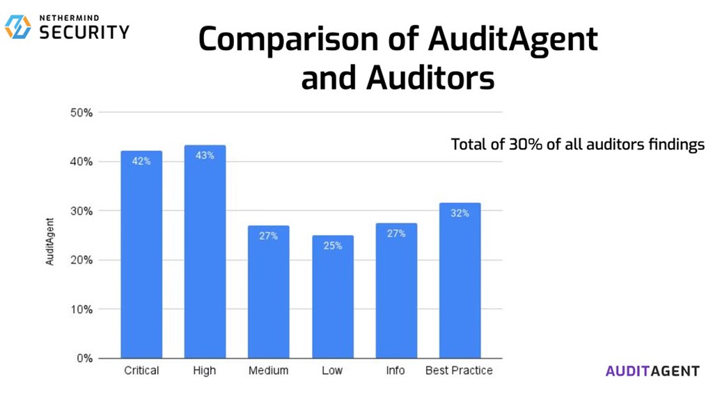 Charts in the study show that AuditAgent’s detection rates were particularly strong in Critical (42%) and High (43%) severity categories.