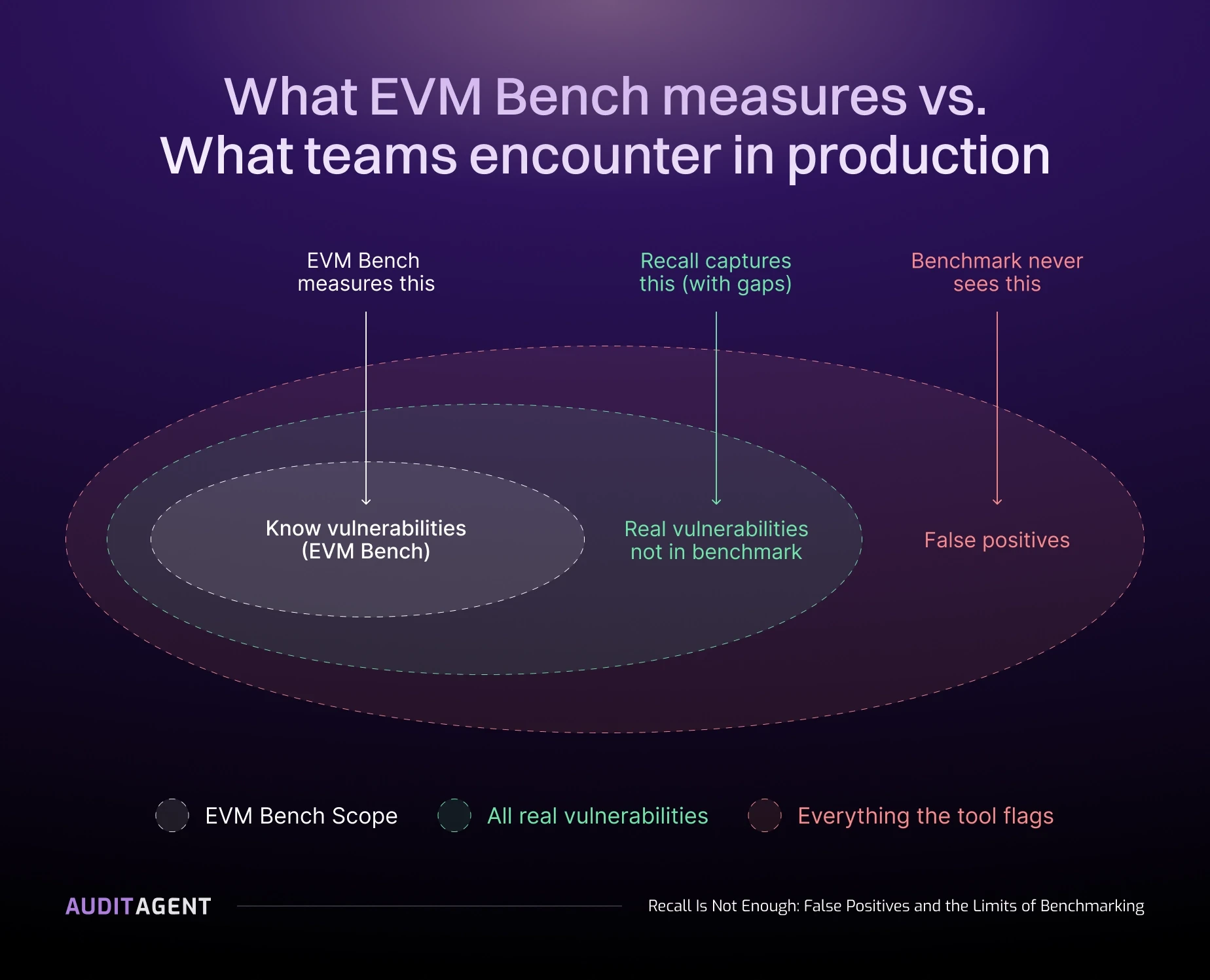 Figure 1: EVMBench scores against the inner ring only. Real vulnerabilities outside the benchmark set and false positives flagged by the tool are both invisible to the benchmark.
