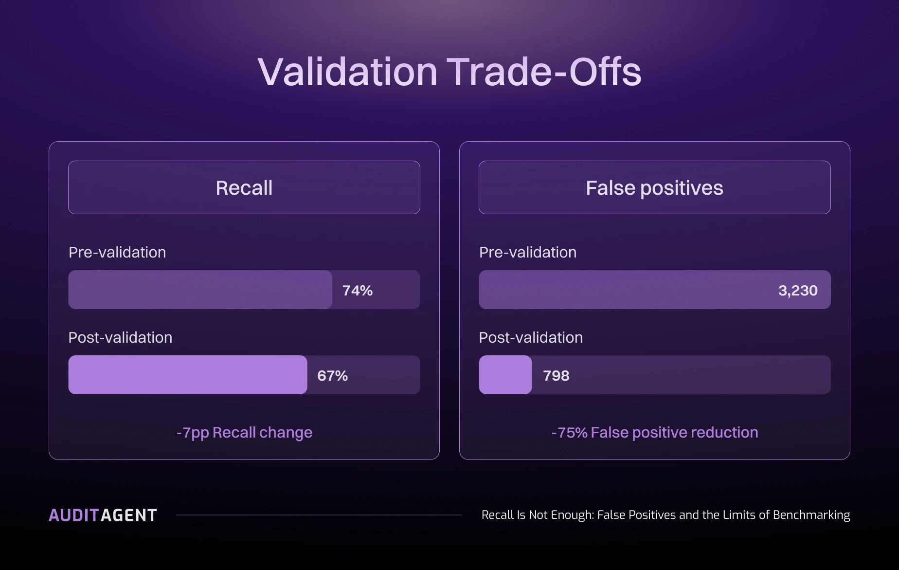 Figure 2: Validation reduces recall from 74% to 67% while cutting false positives by 75% (3,230 → 798).